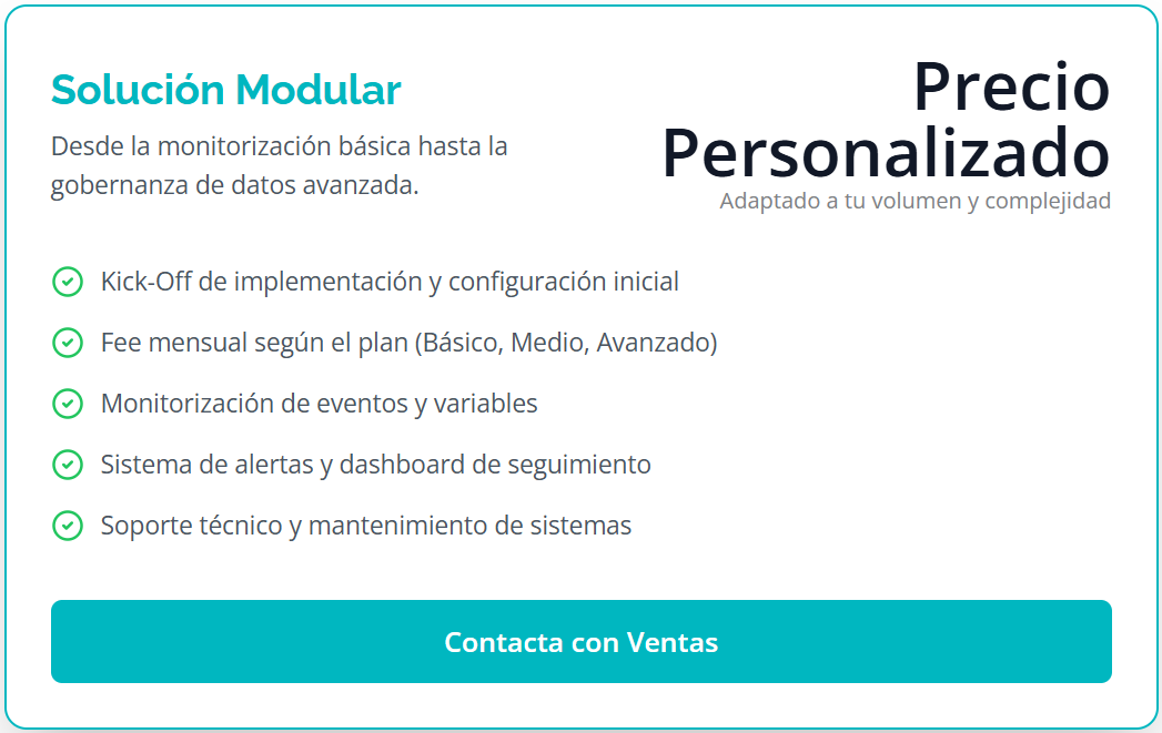 Es un servicio totalmente modular y adaptable. No creemos en soluciones «one-size-fits-all». El proyecto comienza con una fase de consultoría para entender tus objetivos y definir una «biblia de datos» específica para tu negocio. A partir de ahí, construimos la monitorización y las alertas que realmente aportan valor.