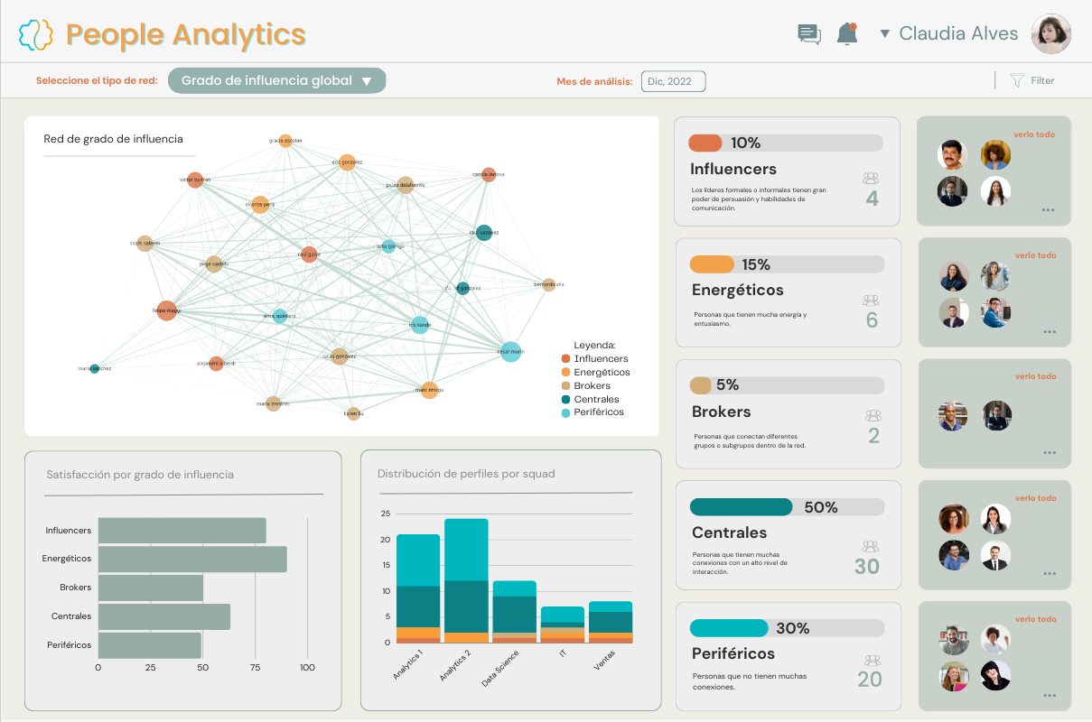 Visualiza los flujos de comunicación e interacción. Identifica líderes informales, equipos en riesgo de aislamiento y cuellos de botella.